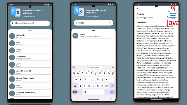 Aplikasi ini menampilkan bahasa-bahasa daerah beserta penjelasannya. Untuk data aplikasi ini saya dapatkan dari API Public ya, jadi jika suatu saat API sudah tidak berfungsi, silahkan hubungi Developernya DISINI.